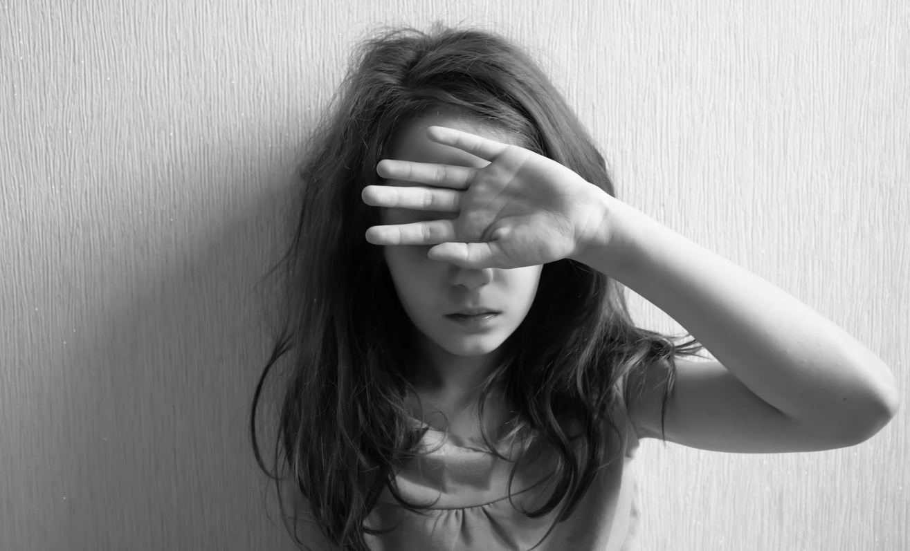 Little girl with long hair covers her face with hands
